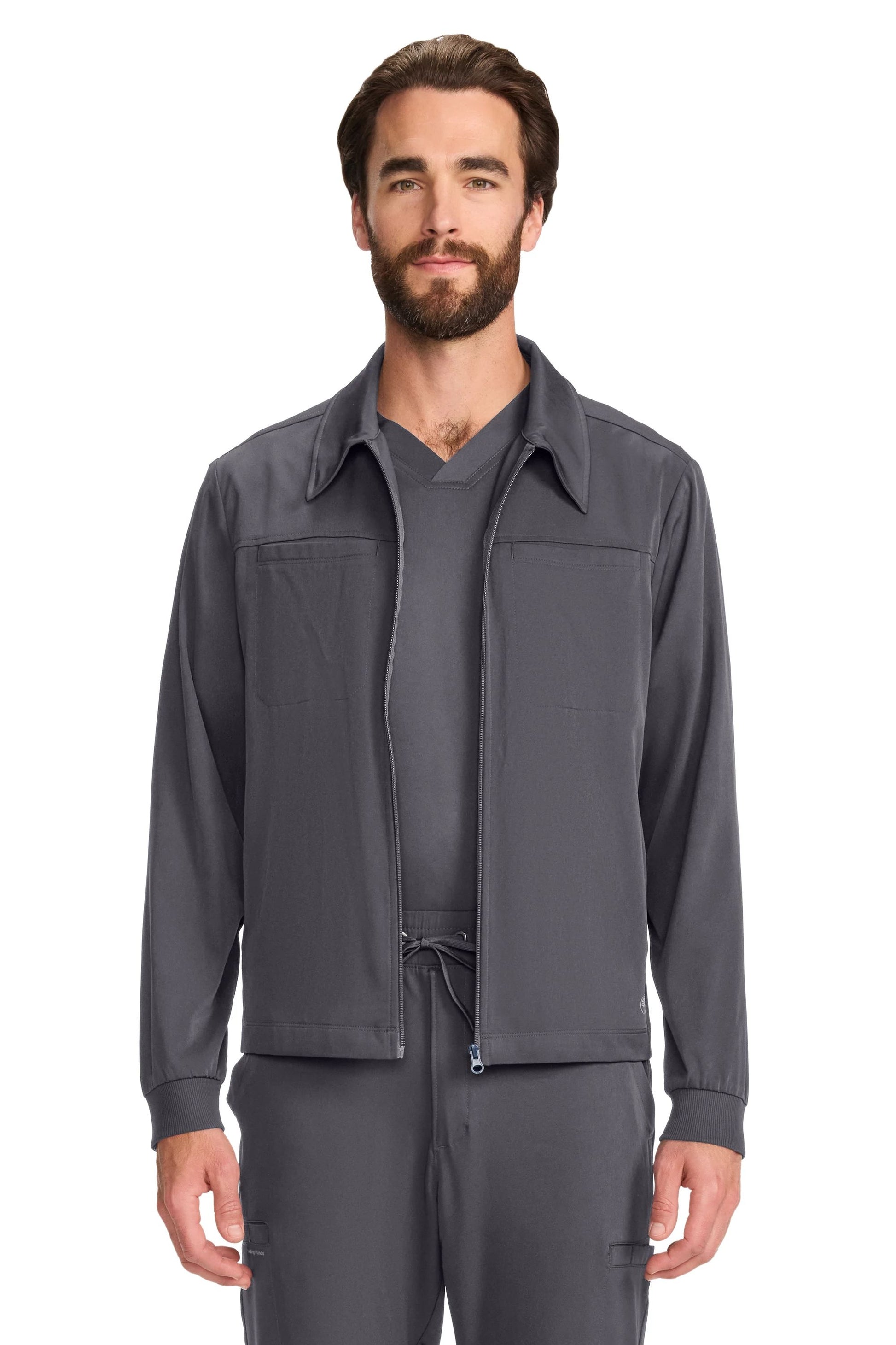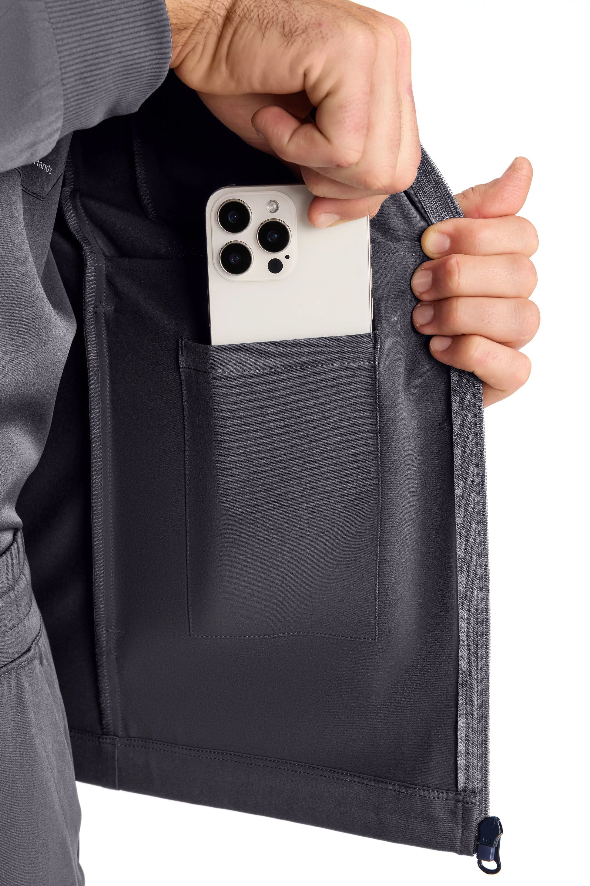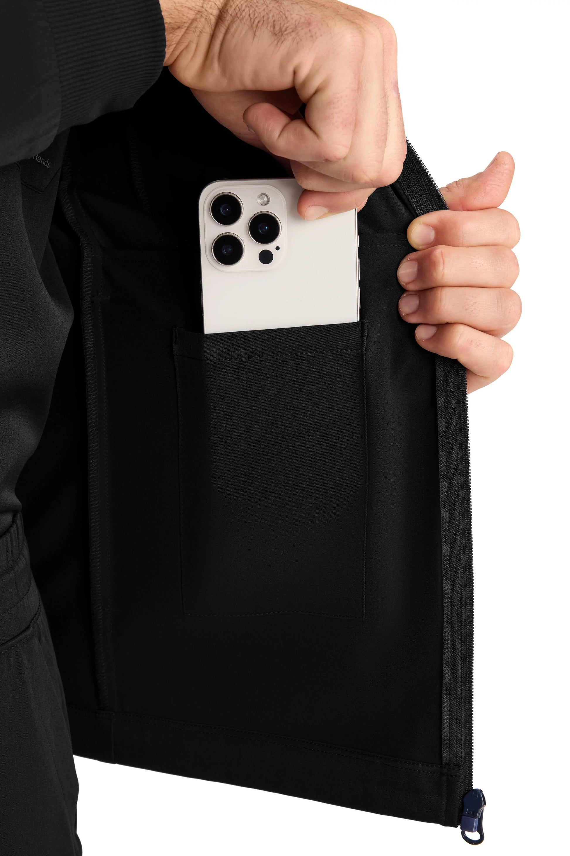 The Murphy zip front men's style jacket from the HH Works collection provides utility and all-day ease. The 4-way stretch and moisture-wicking fabric, keeps you dry, warm and ready for anything. Seven well placed pockets inside and out give you room to carry the essentials without adding bulk. Finished with a fold-over collar and knit cuffs.
