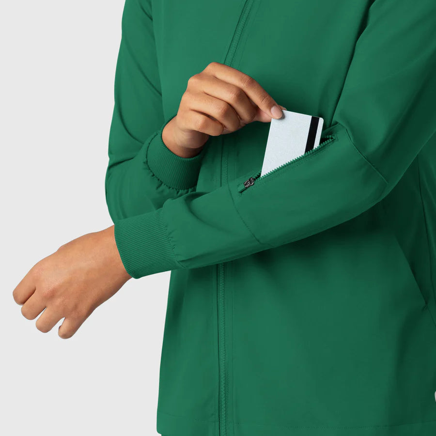 Wink Boundless offers moisture wick technology to keep you cool and dry all day long, 4-way stretch fabric for movement and flexibility, a functional four pocket design, and fade resistant colors. Wrinkle resistant and soil release 50% polyester/43% recycled polyester/7% spandex fabric makes for easy care and a sharp appearance through long shifts. Stay comfortable even in chilly offices and air-conditioned patient rooms with this women's essential warm-up jacket. It's the perfect piece to layer over your scrubs to keep you warm so you can stay focused. A generous pocket on the inside is designed to hold your tablet, providing hands-free mobility as you move between rooms and down corridors. The full-zip front gives you options when temperatures fluctuate, letting you easily transition from more warmth to less. Ribbed cuffs at the wrist add a cozy touch that keeps your hands free to move without material getting in the way.